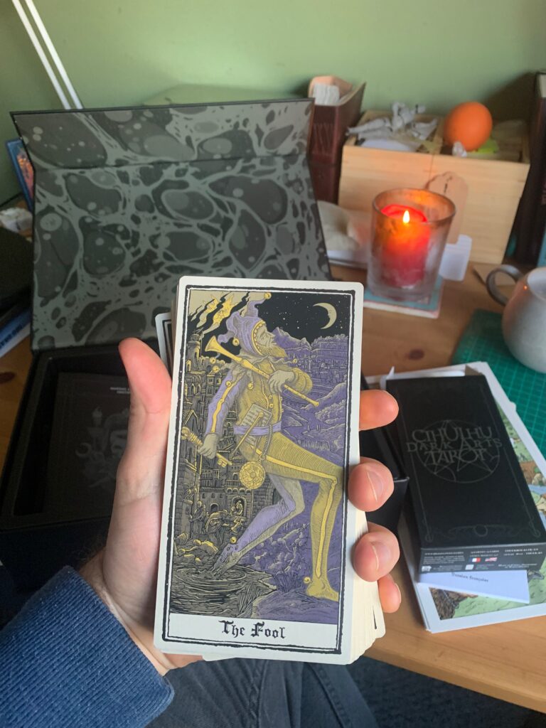 I backed the Miskatonic Editon of the Cthulhu Dark arts tarot because clearly, 27 decks of tarot cards are not enough. And I am a big fan of HP Lovecraft’s work. The man less so though I do appreciate the lengths he will go to to find the perfect pen.